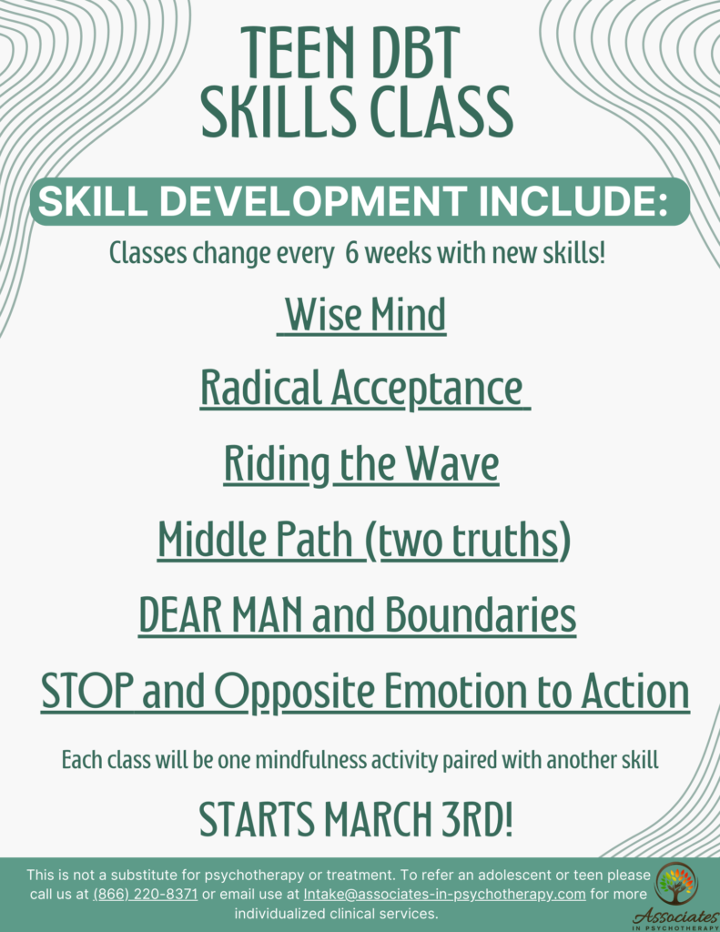 The Teen DBT class is an open and engaging virtual psycho-educational class based in Dialectal Behavioral Therapy for ages 14-18 yrs to enhance their ability to manage stress, emotions, and relationships.